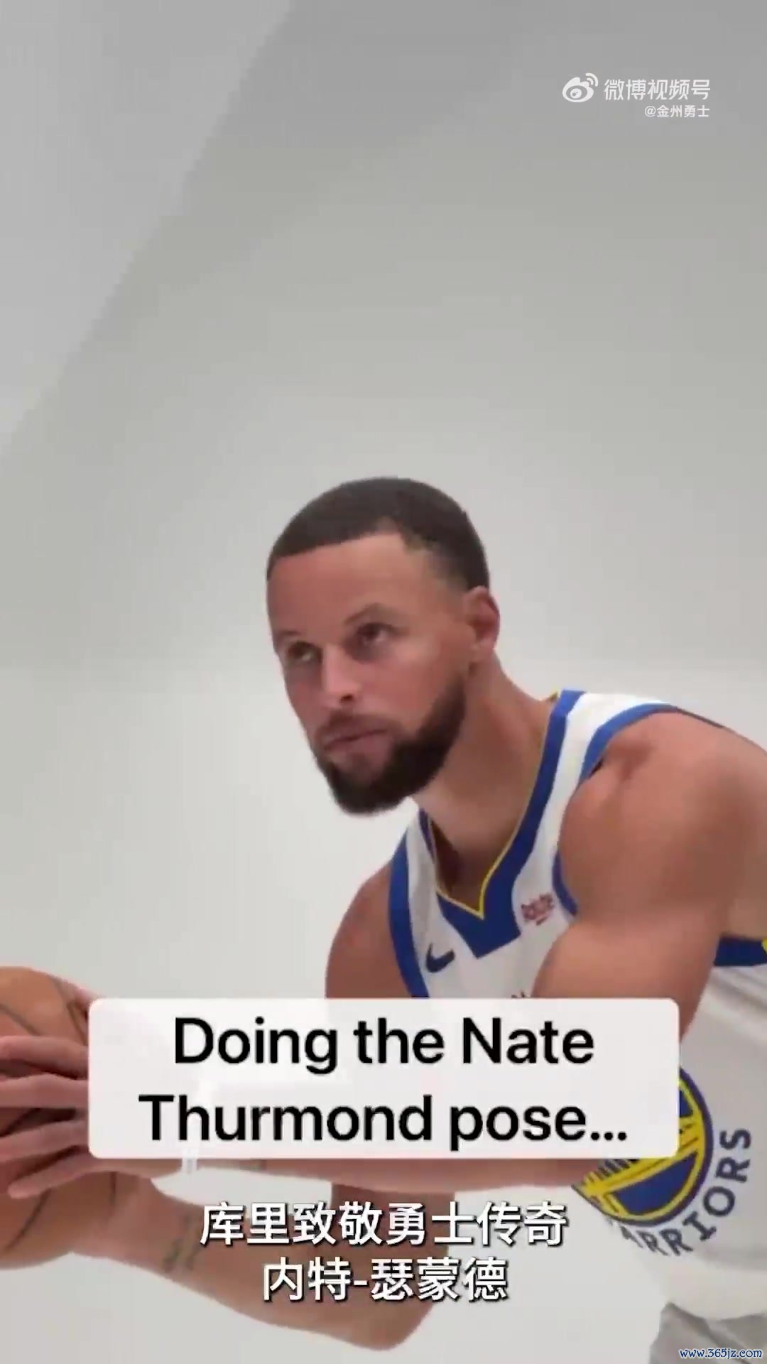 拍摄期间,库里模仿场馆内减震的内特-瑟蒙德海报上的动作,致敬这位队史传奇。