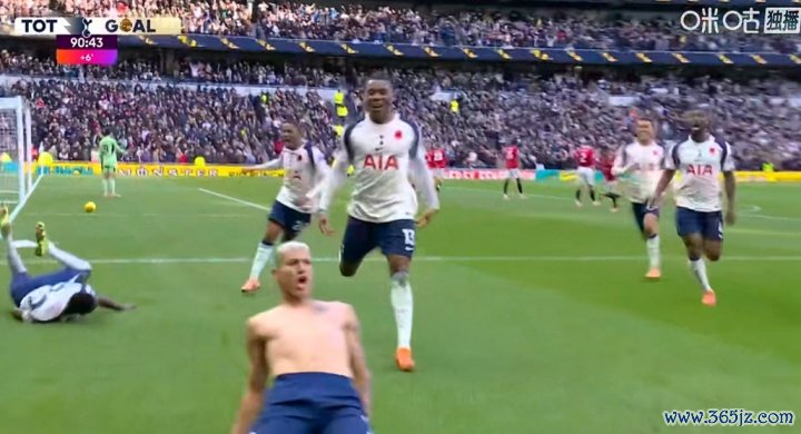 11月08日讯 今日英超曼联客战热刺,比赛第91分钟里沙利松破门反超曼联!进球后里沙利松脱衣激情庆祝,德甲NBA直播随后捂脸情难自已。